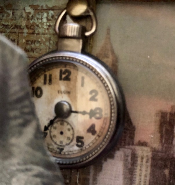 - Put a brad in the center of the 1″ clock sticker from the Curiosities sticker book, distress the edges and pop this up in the base of the pocket watch with foam tape. I drew clock hands on mine using a fine tip marker. Glue the pocket watch cover in place over the base. Glue the “clock” at the right edge of the ticket in the left corner. I glued a brad head in the upper ring of the watch so it looked like it was hanging from it.