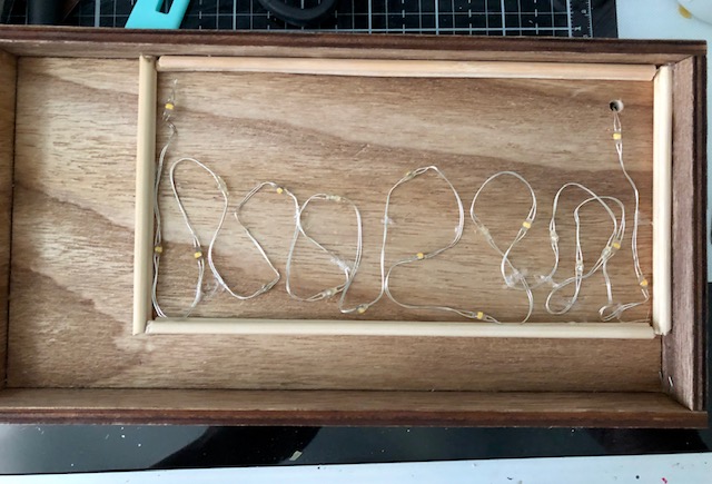 2. I drilled a hole in the upper right corner to thread the lights through and coiled them along the bottom edge of the box approximately where the buildings are in the scene. You can glue the light strand in parts to get it to lie flat but do not put glue directly on the bulbs.