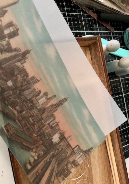 - You can use several different things to prop your vellum up. In this instance I used wooden dowels cut to the length and width of the vellum scene I chose. I stacked (2 high) and glued several dowels together in the tray to form a box.