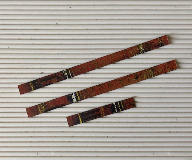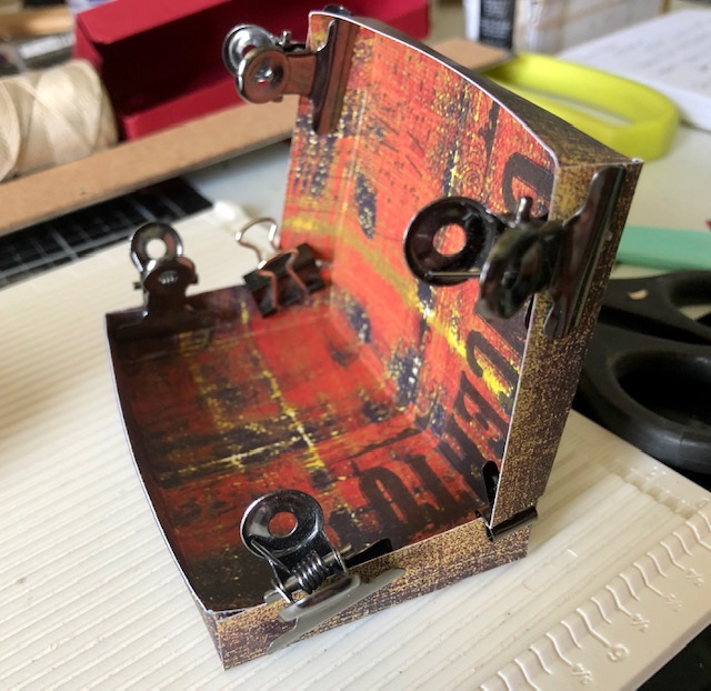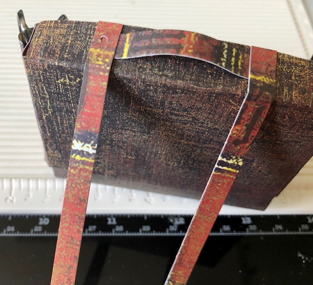 Note one side has four full sides and one has three. I like to use clips to keep it all together while it dries. After the sides are dry, glue the box together. This particular paper as you see has red on one side with lines. I cut three 1/4″ strips to use as straps on the suitcase. The smallest strap is about 1 1/2″, while the two longer straps are about 3 1/2″-4″. Note the straps don’t have to go completely around as the back of the suitcase won’t show.