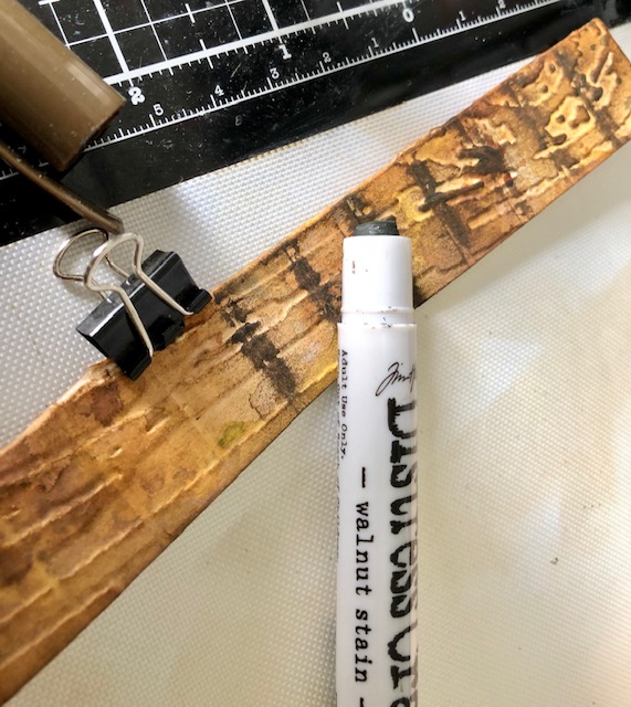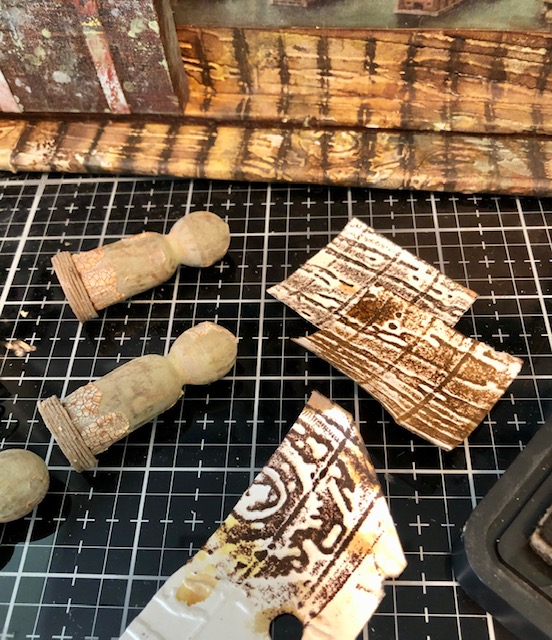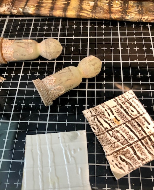 I applied opaque crackle paste haphazardly over the pillars and continued to stain them. As a final touch to make them more “wooden” looking, I used leftover embossed scraps from the dock. I inked the scraps up in vintage photo or walnut stain and wrapped them around the pillars to give them wood grain lines