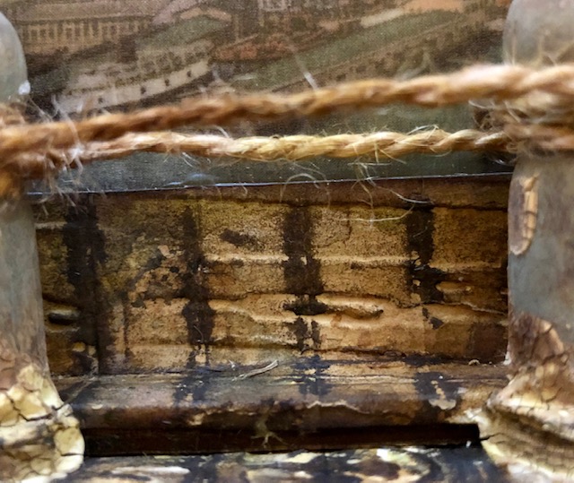 After they were dry, I glued them in place along the dock. I applied more crackle at the base of each pillar and continued to stain and distress them with inks. I then wrapped thick twine that I had stained using distress inks around the pillars.