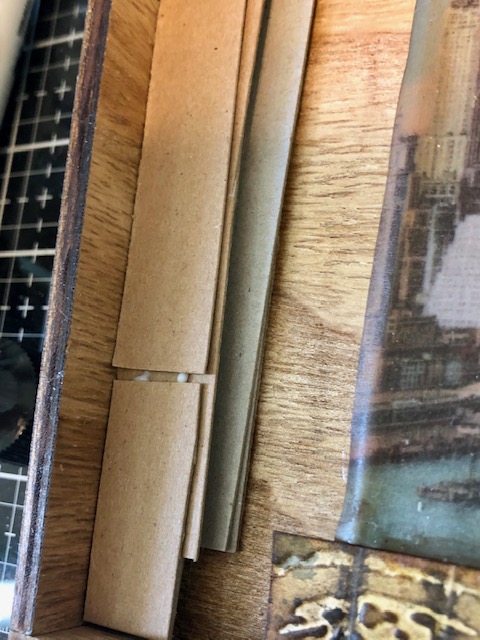 6. Because I wanted my paper doll to sit on the outside of the box, I built up the left side of the tray with scrap pieces of chipboard. This way the large ticket we will glue here will sit flush with the vellum scene.