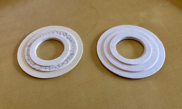 7. The life preserver. This is a bit odd, but stay with me =). For the life preserver I cut several circles out of cardstock- 4 each of 1 3/4″, 1 3/8″, 1″ with a 3/4″ hole punched out of the center of each one. Make two stacks of descending circles using 2 of each circle glued together, then glue these stacks back to back. I scribbled on one to make it easier to see.