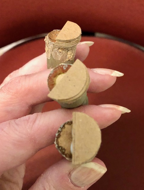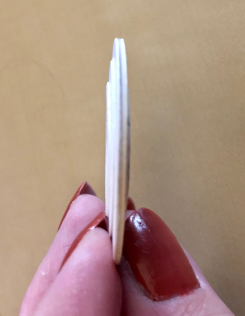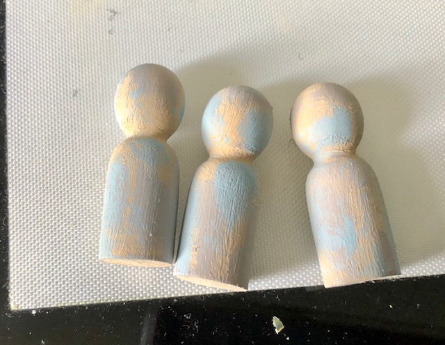 - The “pillars“: I used wooden pegs I found at the craft store. They are marked as “people”. I used speckled egg, vintage photo, and walnut stain to color them. I then cut several small circles of chipboard (3/4″). I cut these circles in half, stacked several and glued them to the bottom of each pillar. The reason for this step is that the pillar sits half on the edge of the tray and half on the new base. The number of circles you will need to stack will depend on the thickness of the chipboard you use.