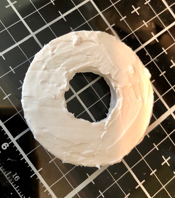 Next, I coated it in a couple of layers of modeling paste, smoothing the edges of the paper circles. The reason for the extra circles was to round it out to look like a real life preserver. My husband thought this was a picture of a bagel …lol