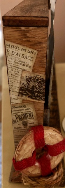 Next, I distressed it with some vintage photo ink. For the stripes I cut some thin strips from the strap of a Target shopping bag, distressed them with vintage photo and glued them on. Then I glued the life preserver on top of the coil of twine on the left side of the tray.