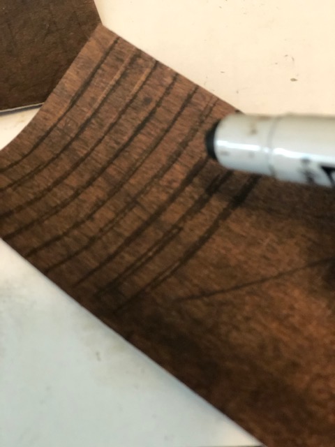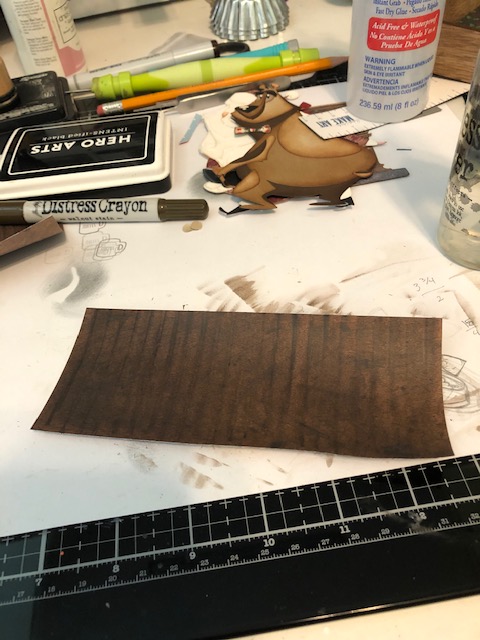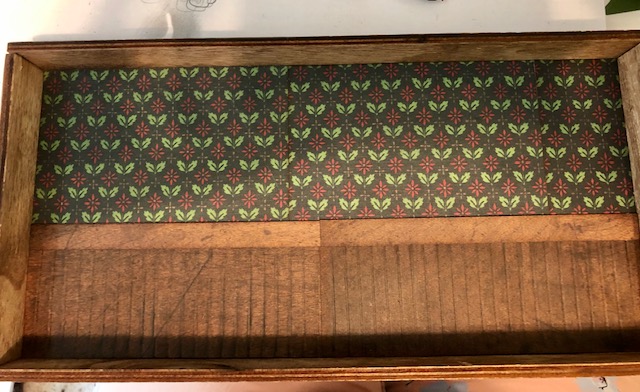 4. The background. The Christmas wallpaper comes in 5′ x 8″ sheets. I cut two in half to measure 5″ x 4″ and glued three of them to the upper half of the tray, cutting the last piece to fit. I cut some wood patterned paper to fit the bottom half of the tray and scored it at 1/4″ intervals. I then used distress crayon to darken the creases, smudging the lines with a damp finger. For the rail, I cut some 1/2″ strips from the same paper and glued it to the top of the “bead board”.