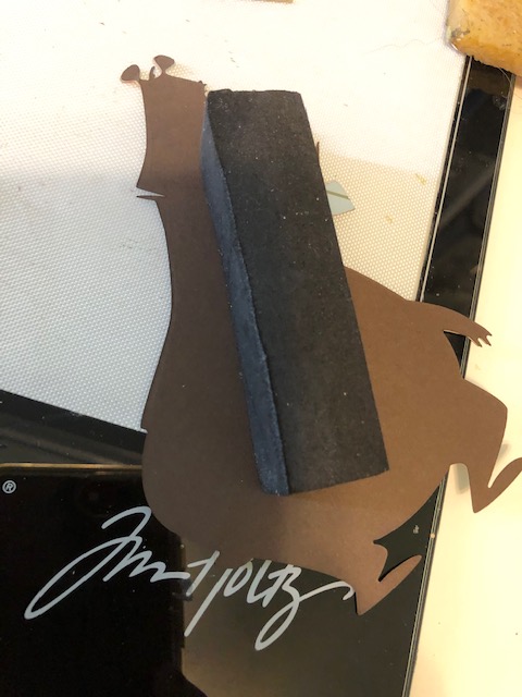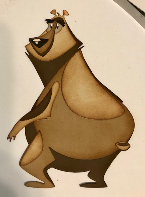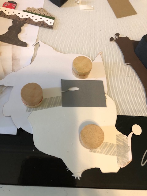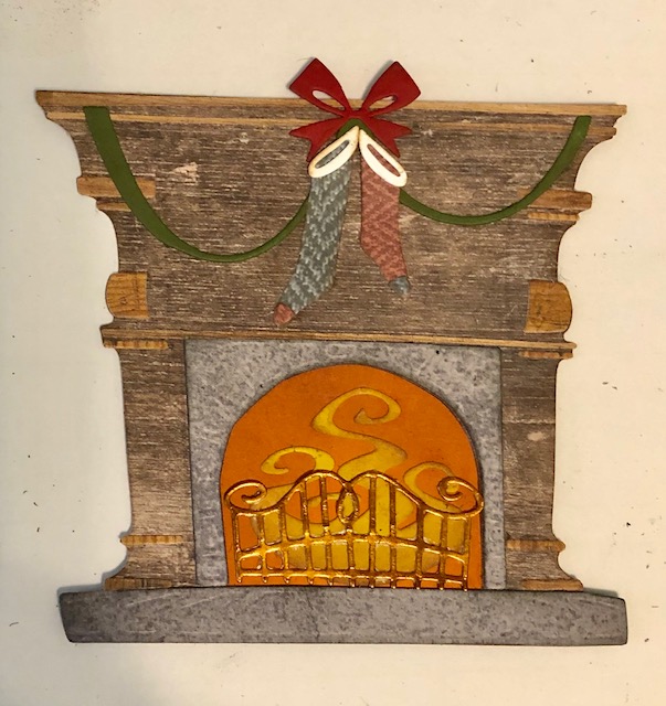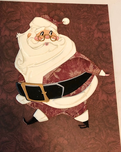 1. Assemble your colorize dies- Theodore, Jolly St. Nick, Fireside and the gifts from Santa’s Helper. There are numerous videos with assembly instructions for these, so I won’t go into detail here. I did give Theodore a bow tie, stamped and die cut from the Crazy Things stamps and dies. I stamped it on some Xmas looking paper I had. I distressed the edges of each piece as I assembled it. I used Vintage Photo for all except the white portions on Santa, for which I used a pale grey- Tin Pail, on the edges. An additional note, Santa is one of the older dies. I noticed Theodore has a solid back piece to attach everything to, but Santa does not. He has two large sections, the body and the head/beard. I used washi tape to attach these two sections together as a I built him and did end up gluing a scrap piece of paper to keep this joint sturdy.