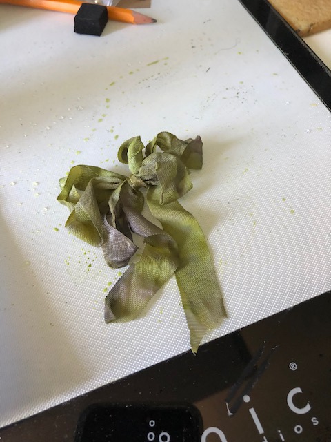 6. Finishing touches. I glued some tinsel along the sides and upper edge of the box, and some cookies on the floor. For the ribbon, I dyed some vintage seam binding, tied in a triple bow, with Iced Spruce and Peeled Paint oxides. Once dry, I hand stitched a jingle bell to the center and added a gold embellishment.