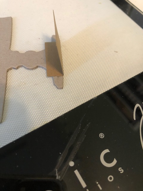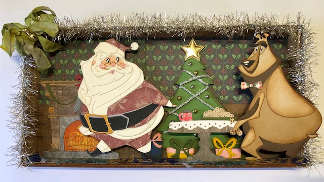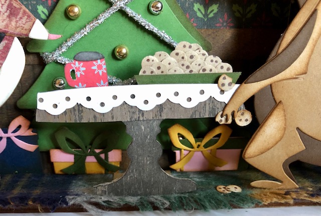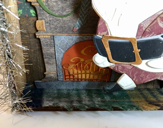 5. Assembly. I wanted everything to be at varying levels. The first layer is the fireplace, the tree and the presents. Those all got set in place using a layer of foam tape. The next layer was Santa. I keep a jar of old wooden Bingo numbers I got for layering and for use in mixed media projects. For Santa I made three double stacks of these numbers and glued them to his backside, then glued him in. The last layer is Theodore and the table. For Theodore I glued the foam spacer that comes with the vignette trays (yes, I tend to save everything) to him and glued him in on the foam. For the table I cut a small scrap piece of paper, scored it at 3/8″ and glued the “hinge” to the bottom of the table. You may have to trim a little so it doesn’t show. This piece got glued to the floor. I then glued the table at the spot where it overlaps Theodore’s hand. If you want to have him holding some spare cookies you may want to glue those in his hand first.