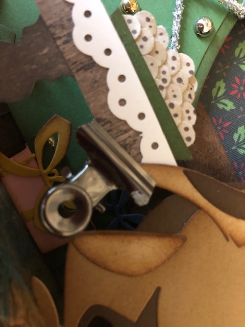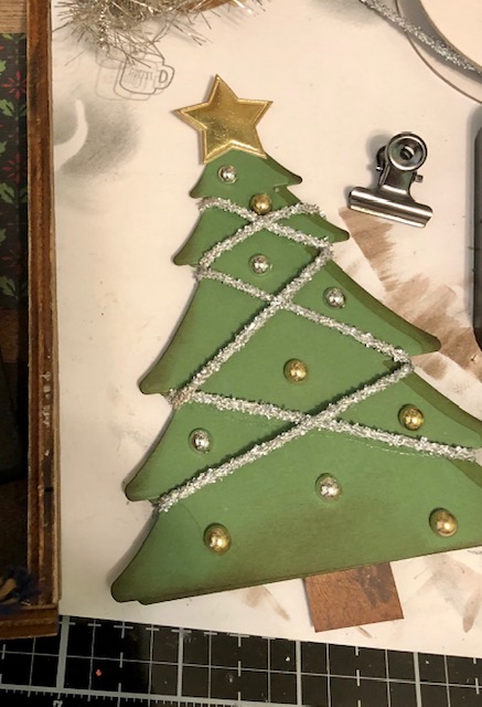 3. The tree. I cut two trees out of green and a slightly darker green and staggered them slightly to indicate a shadow. I wrapped silver cord up and back down the tree and glued the ends to the back. Then I attached silver and gold embellishments on the tree, added a gold star, and added a trunk simply cut from a scrap of wood patterned paper. I distressed all the edges in Vintage Photo.