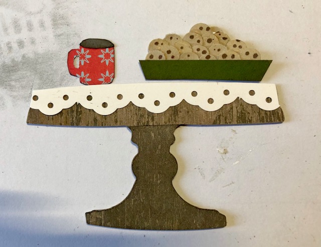 2. The table. For the table, I used the pedestal portion of the Sizzix bigz die-Bell Jar with pedestal. I cut two out of different wood image papers, using one as a contrast leg, and one out of chipboard for added sturdiness. For the tablecloth I used a border punch to make a strip out of white and glued it to the top of the table. I freehand cut a bowl out of scrap paper and used a hole punch to punch the cookies out of tan paper. I added “chips” to the cookies with a copic pen. I used a stamp of a mug from the sloth stamp on the back of some patterned paper and fussy cut the mug shape.
