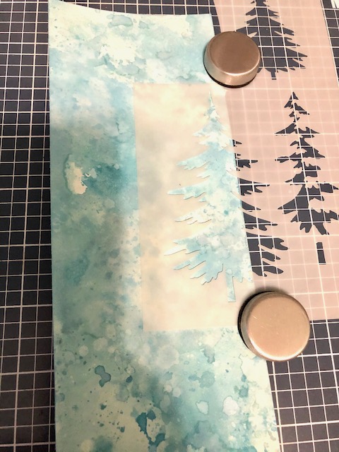 5. Die cut a small cross stitched rectangle (approx. 3″ x 1 3/4″) from white card stock and mount your letters to it. Cut three sections of scrap white card stock with wavy borders and attach them approximately 1 1/2 ” from the bottom of the main image watercolor piece to look like mounds of snow.