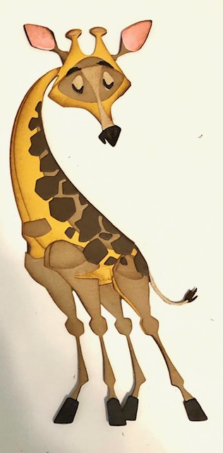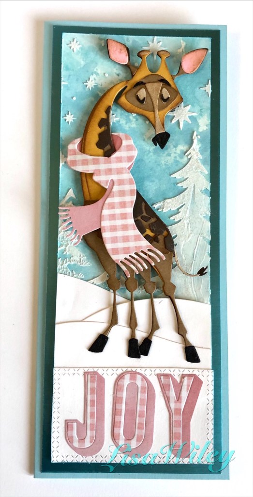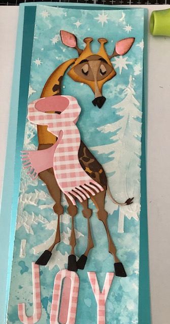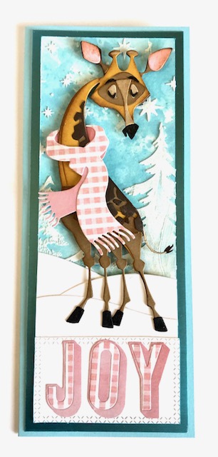 4. Assemble Gertrude, the scarf from Winter Wardrobe and the Joy letters. Sizzix.com has wonderful videos that explain the assembly process for their Colorize dies so I won’t go into detail here. You will need to snip part of the scarf in order to slip it around Gertrude’s neck. I attached a small piece of card stock to the back of the scarf once I had it around her neck, just for extra stability. I also popped a foam dot under the center section of the scarf to keep it attached to her body.