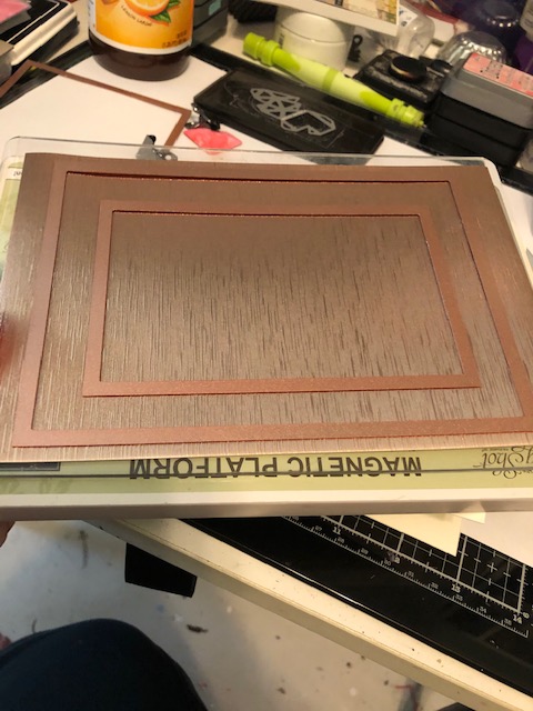 3. Make a 5″ x 7″ card base (10″ x 7″ piece of card stock, scored to make a portrait orientation base). Cut a mat of the gold satin card stock – Mine is 6 7/8″ x 4 7/8″. Here is a tip if you like to conserve your fancier papers: Die cut out the center of the mat to save for later. Just make sure you leave enough of an edge that the next layer will cover it.