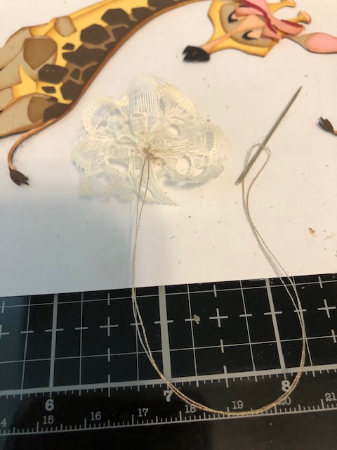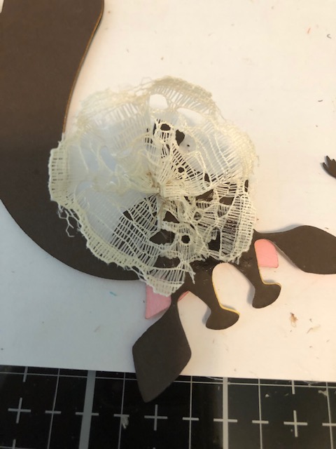 2. From Winter wardrobe I die cut the top hat and the ribbon. You will need to trim the tails of the ribbon if you don’t want it covering Gertrude’s eyes. I glued those pieces to the happy couple. For Gertrude’s veil, I hand gathered a small piece of lace trim with needle and thread and glued it to the back of her head.