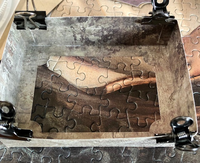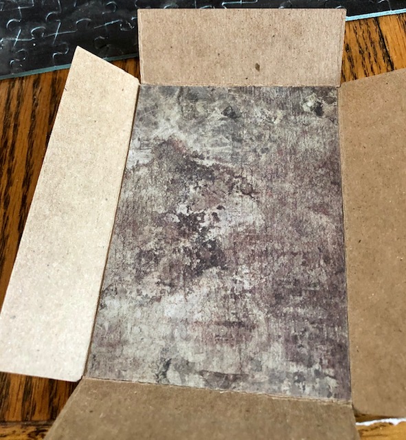 1. Die cut your curio box. For the lid I used a sheet of Departed paper and the smaller of the two frames. I cut the bottom from thin chip board for added stability, then covered the sections that would show in coordinating Departed paper.