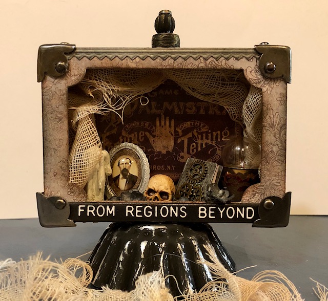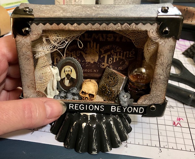8. I assembled all of my pieces on the box bottom, adding a book charm and a skull. I glued the center of the mummy cloth then pulled apart the strands a bit to make it billow out on the sides. Then I glued the lid on and glued the entire thing to the tin.