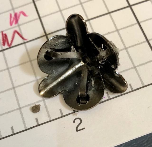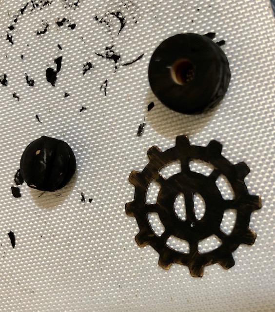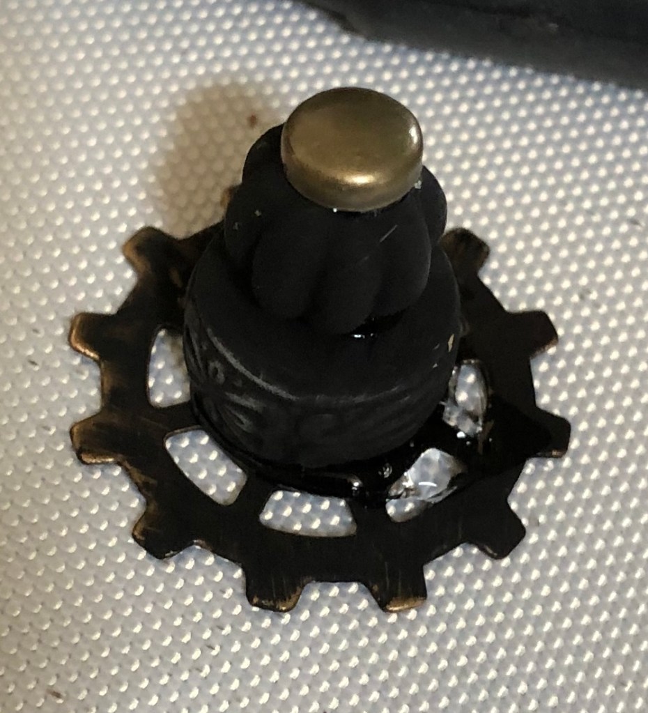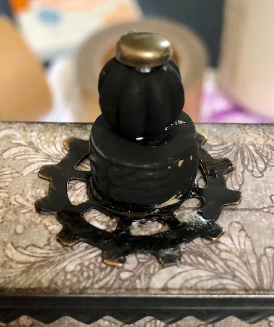 9. For the finial, I painted a gear and two beads with black paint, let dry and rubbed them with steel wool, then rubbed them with a little bit of gilded alloy ink. Then I glued a brad into the top bead hole to cap it. This got glued to the top of the box.