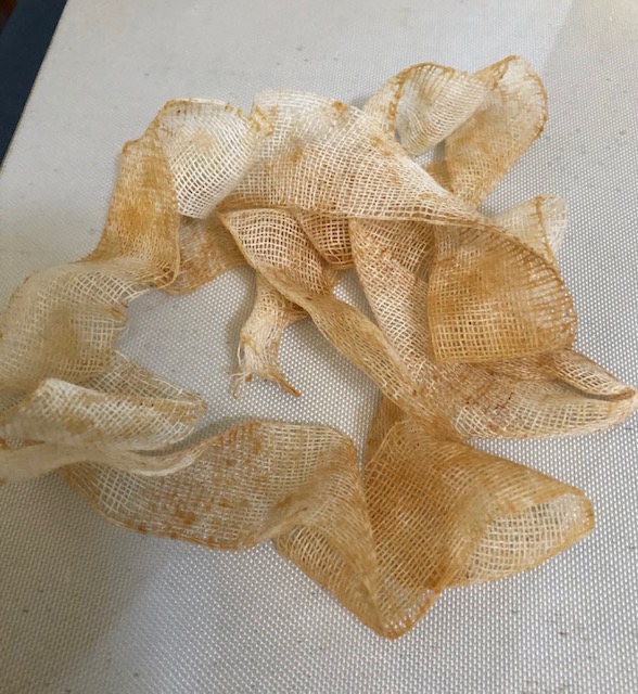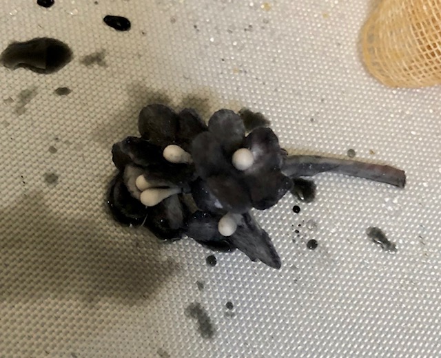 4. I took a length of mummy cloth and rubbed it in a mix of Vintage Photo and water and let dry. Once dry I tied a small length of twine in the center, so the cloth would drape down the sides of the box. I took one bunch of paper flowers and dipped them in a mixture of Black Soot and water and let them dry, then separated them.