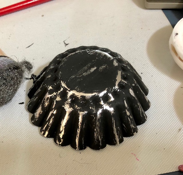 7. For the base, I covered a vintage tin in black paint. After it was dry, I rubbed it with steel wool to distress it a bit.