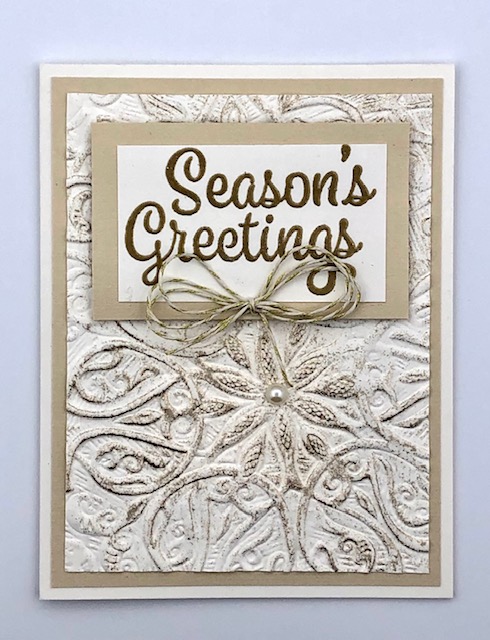 Hello everyone! I have a simple card for you today, using the beautiful Tim Holtz Engraved embossing folder. This is a nice card for mass producing if you have a lot of recipients that actually looks prettier in person. The gold really doesn’t show well in photographs.