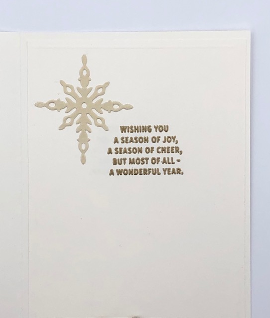 6. For the inside of the card, I cut a piece of buttercream card stock 5 1/4″ x 4″. Using a score board I scored a line 1/8″ along all sides of the piece (this is optional, I just like how it looks). I stamped a sentiment, embossed with more gold embossing powder, slightly offset to the right, and added a snowflake die cut from the same gold card stock. Attach this to the inside of your card.