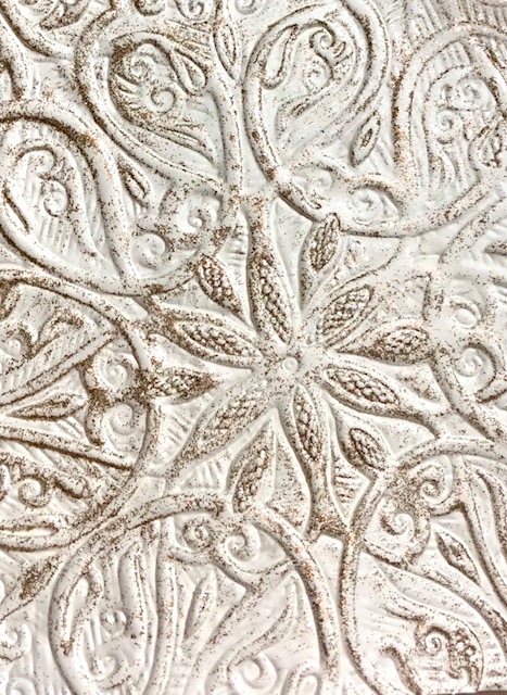 - Emboss a 5″ x 3 3/4″ piece of buttercream card stock using the Engraved 3D embossing folder. It is recommended for these types of folders to spritz your paper lightly with water before embossing and to run it through a few times to really get a good impression. After it is dry, rub a bit of the golden sand kiss over the surface of the piece, using the foam applicator that comes with the kiss. Let dry.