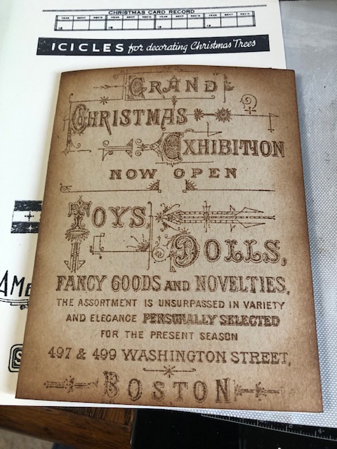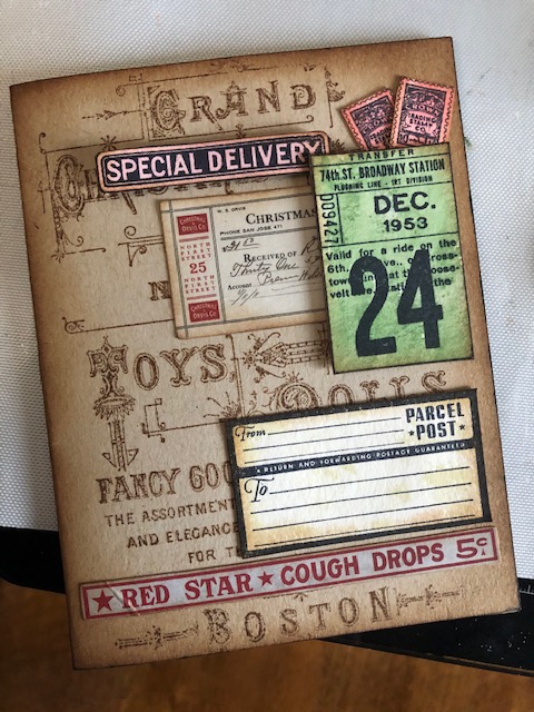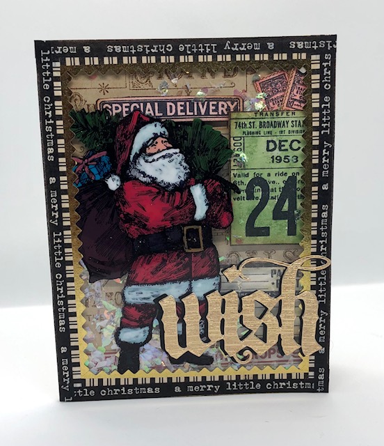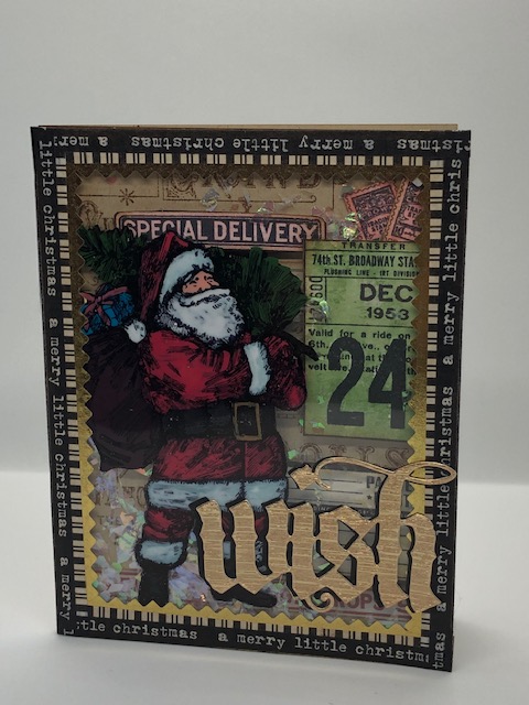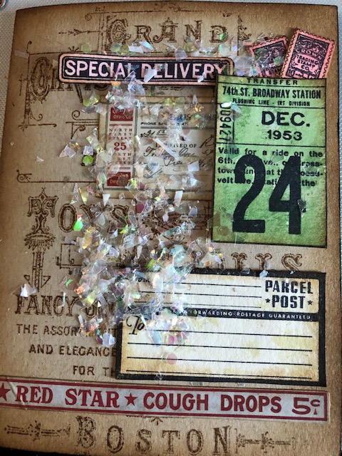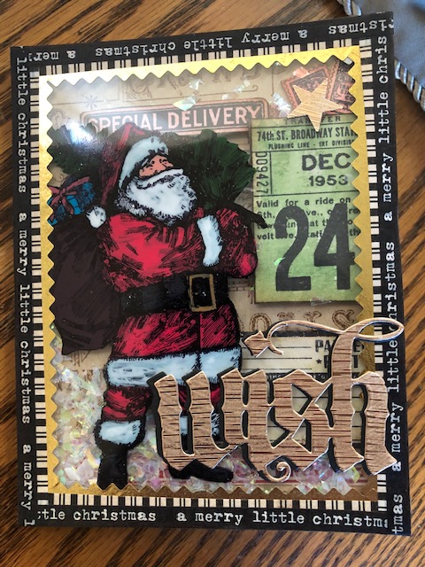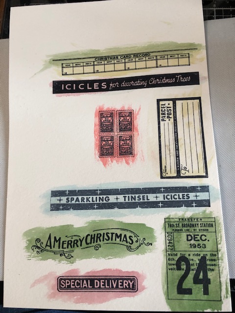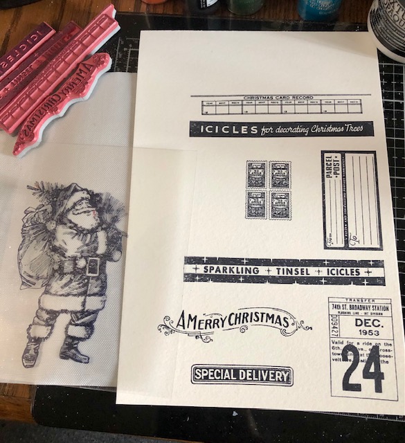1. Make a card base from kraft card stock for a 5 1/2″ x 4 1/4″ card. Stamp the advert image from the Music and Advert set in Vintage Photo ink onto the card front. Distress the edges and set aside. Cut an acrylic sheet to measure 5 1/2″ x 4 1/4″. Stamp the Santa image from Vintage Holidays onto the acrylic using archival ink. I wasn’t sure what other images I was going to use so I stamped all the other images from the Vintage Holiday set onto watercolor paper, using black archival ink.