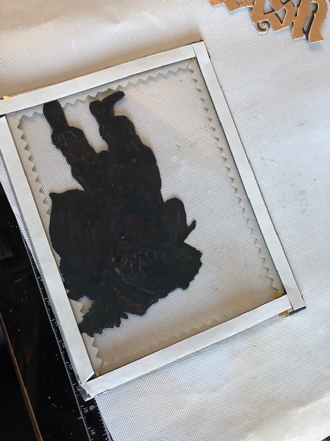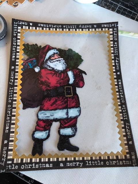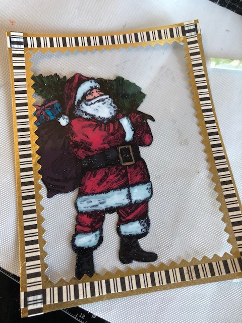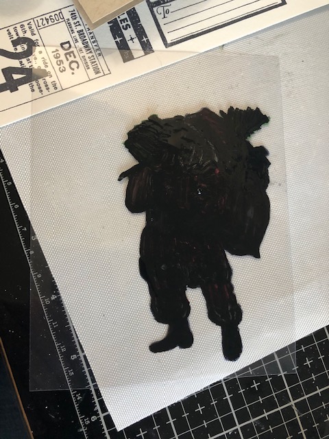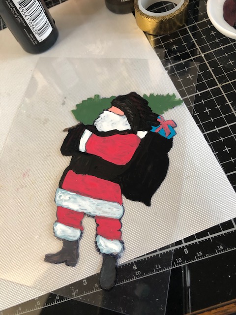 2. Paint the Santa image on the reverse side of the acrylic sheet using various distress paints. Make sure you fill to the edges of the image. To make sure I had no clear areas remaining, after the first paint had dried, I went over the entire image in black soot paint.