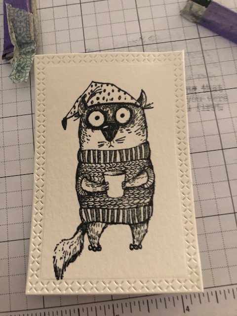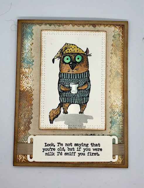 - Make your background: I smooshed Vintage Photo and Speckled egg oxides on my craft mat, sprayed it with water and tapped watercolor paper (5 1/4″ x 4″) into the colors. I did several layers and dried between each layer of color. Once it was dry I used the cozy knit embossing folder to emboss the layer. I finished by inking the edges with Vintage Photo distress ink.