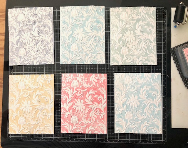 1. First I figured out which color I was going to use. I ended up making several different ones as I was having issues deciding. I used the brayer technique Tim showed in his video last week. I brayered ink onto the side of the embossing folder that is indented, then ran it through my machine several times. I ended up using the Antique Linen one.
