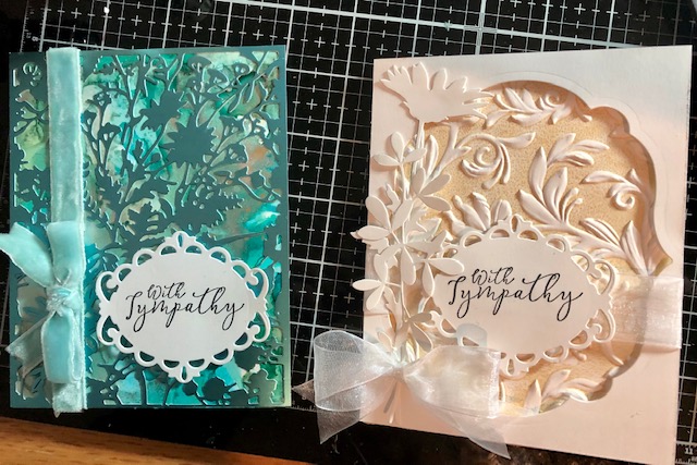 I’ve been a bit AWOL for the last few weeks. A dear friend of mine has been fighting for her life since surgery in December. She fought hard until the end but unfortunately passed away last week. All of her friends and family are understandably devastated. She was a wonderful person and was always cheering me on with any project I undertook. I had trouble feeling creative and stumbled a few times in making these cards. I ended up making two and decided I would send the blue one to her daughters. I wanted to share them for those that, like me, may have trouble feeling creative when dealing with sadness and may just want to follow someone else’s design. Both cards are 5 1/2″ by 4 1/4″