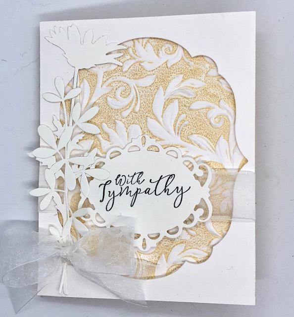 3. I cut out several of the wildflower stems and chose two to adhere to the left hand side of the card. I then added a bow to the bottom of the stems. I stamped “with sympathy” on white card stock, die cut it, then adhered this to the center of the card front, using a foam square underneath the center of the ribbon to keep it even with the white layer.