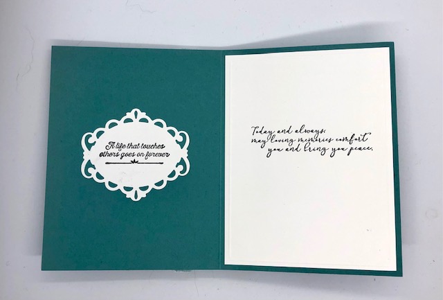 4. I stamped “with sympathy” onto white card stock then die cut it using the Spellbinders die. On another sheet of white card stock, 4″ x 5 1/4″, I stamped the inside sentiment. Once it was dry, I put it on my score board and scored around all the edges 1/8″ from the edge. On another small piece of white card stock I stamped the Unity sentiment, die cut it with the Spellbinders die and adhered it to the left hand side.