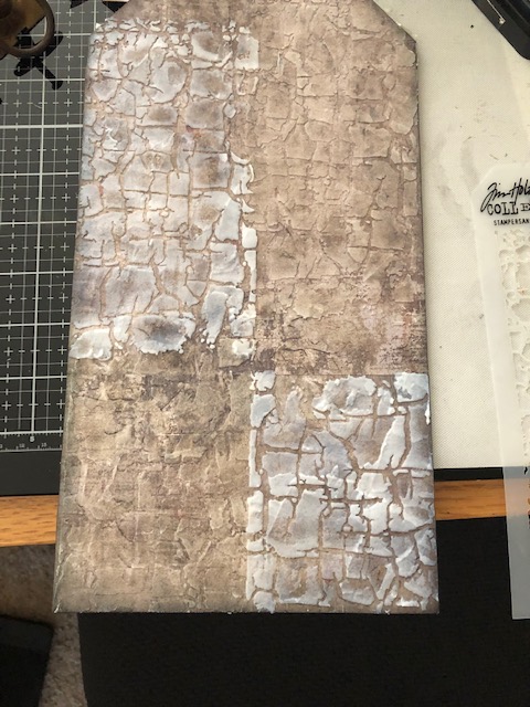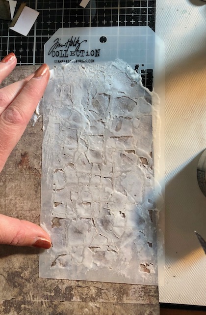 - Cover the thick board tag with two sheets from the Departed paper stash. I chose a design that looked like stone to me. Trim your excess. Be sure to safe the extra bits as we will use them in later steps. Distress the edges of the tag with Vintage Photo ink. Taking the Decayed stencil, apply translucent grit paste over the tag through the stencil using the palette knife. You will have to do this in two steps as the stencil is smaller than the tag. Allow the paste to dry between the two steps. Don’t worry too much about the seams as they will mostly be covered and they really don’t show once the paste is dry.