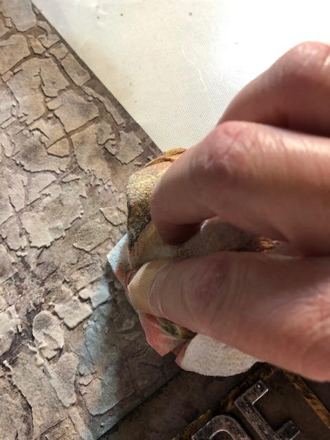 Once the paste is dry, you can add some watered down inks (vintage photo, black soot) to your background for some more depth. I just used my finger to apply inks, wiping off the excess as I went with a paper towel. Set aside to dry.