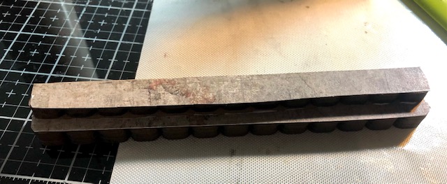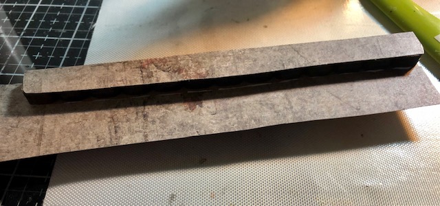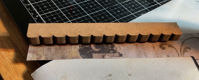 2. Make the ledge. The trims have several sets of three sizes included. I used the longest trims for this project. Note that each length has two different width pieces. I ended up using three of the wider pieces and two of the narrower pieces. Glue them together in a stack. Then, using the scraps you had left over from covering the tag, cover each of the ledges, trimming along the scallop edge (don’t bother cutting in the scallops, they will get filled in a bit)