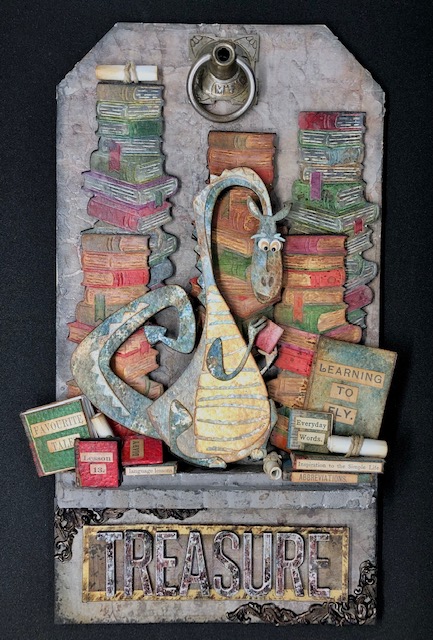Using a palette knife, coat the edges (the scallop side) with opaque grit paste. You can leave a suggestion of scallops as you like, but coat it well so it looks like stone. Leave the top and bottom surfaces flat so it is easier to stack books and add the treasure tag. (don’t panic if you get a little on the edges, just leave it mainly flat) You can also coat the sides in paste if you like). Once it is dry, paint all the portions that have paste, gray.