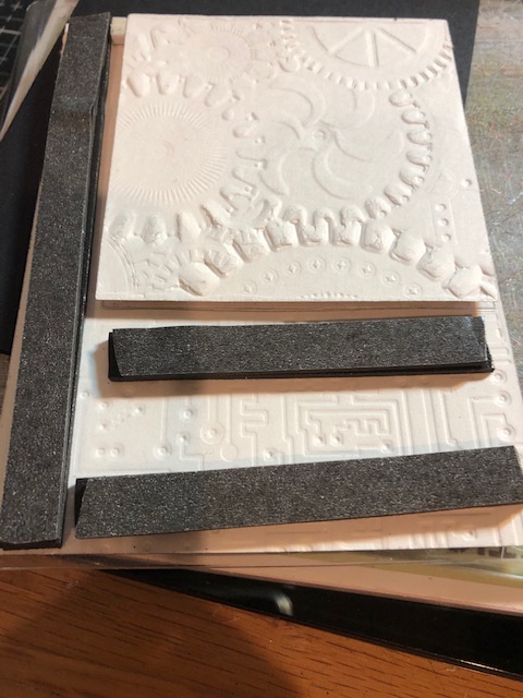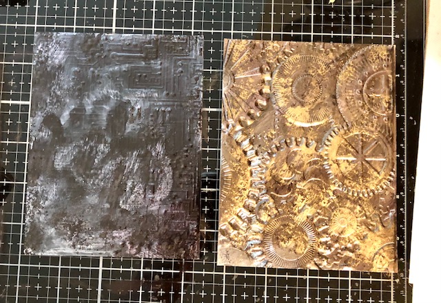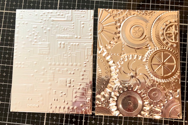 - Emboss two of the foil surface sheets, one with Circuit and the other with Mechanics. These are both silver, despite how the picture looks =). Trim the circuit piece to 4″ x 5 1/4″