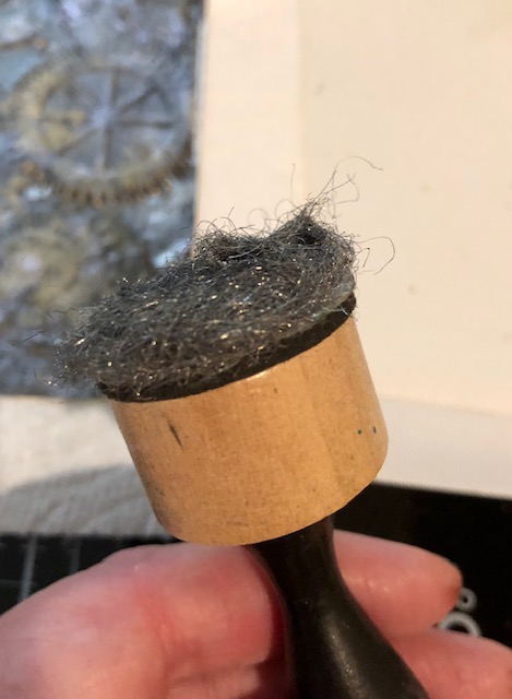 Once dry, rub both pieces with steel wool. I followed Tim’s advice and attached a small piece of steel wool to a dauber. Add inks and rub off until you get the look you want.