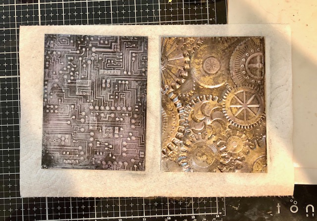 2. Rub pitch black alcohol ink over the Circuit piece, using a dauber and a felt applicator, (dripping the alcohol ink onto the felt). Drip pitch black, mushroom and gold mixative onto another felt piece and use this mix on the Mechanics piece (gears).