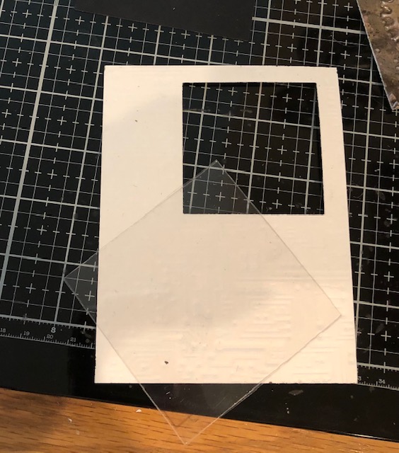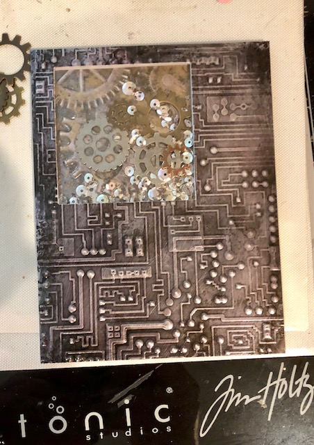 3. Using the larger of the square dies, cut a square from the Mechanics piece. Using the same square cut a piece of acrylic sheet. Then using the smaller square, cut your window out of the Circuit piece in the upper left corner. I realized afterwards that I should have distressed the inner part of the cut out with Black Soot, so do that now if you’d like.