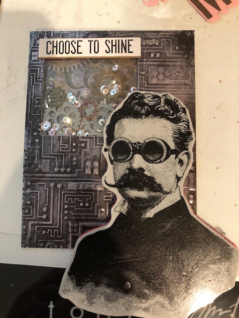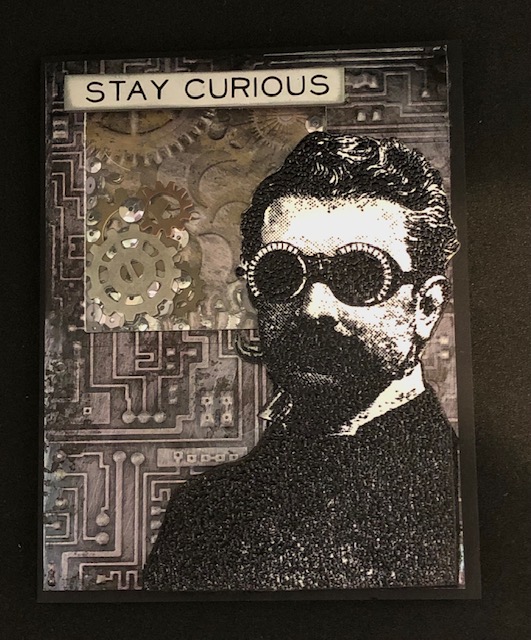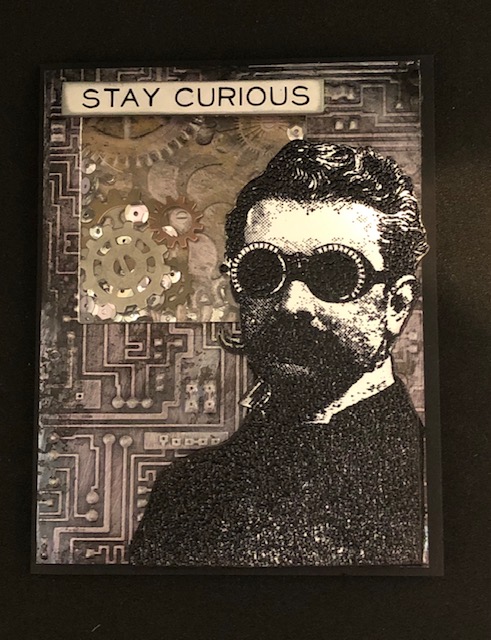 7. Attach the Professor to your card front, then trim any excess. I left his hair sticking over the embossed piece just a little bit. Attach this whole piece to a black card base that will measure 4 1/4″ x 5 1/2″ when folded. I weighed it down with my magnetic base just to make sure it all was adhered well. Attach your desired quote chip. Other quotes I liked were “Choose to Shine” and “Dwell in Possibility”, but ultimately I went with “Stay Curious”.