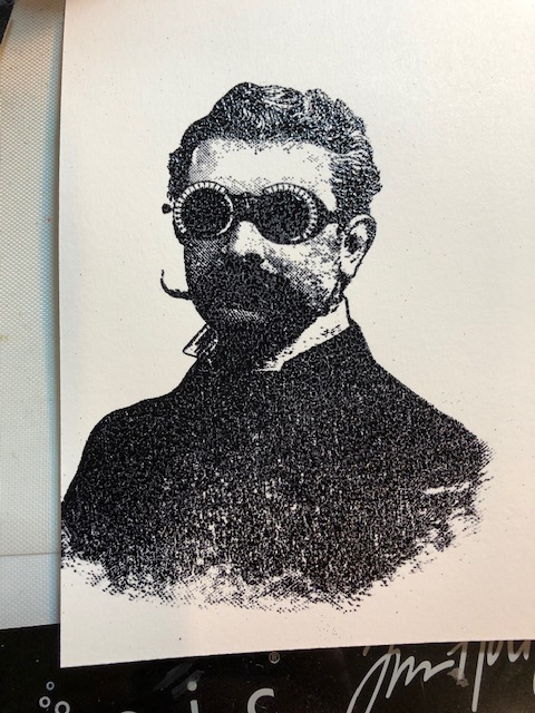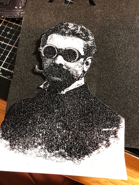 6. Stamp The Professor, using Black Archival on a piece of white card stock and emboss using black embossing powder. Fussy cut him out. Just to give him a little more sturdiness and to pop him up slightly, I attached him to a piece of thin fun foam and fussy cut around that as well.