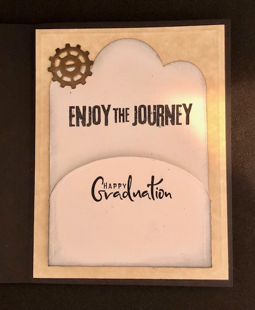 8. For the inside of the card, I cut a piece of parchment patterned paper 4″ x 5 1/4″ and scored 1/8″ around all the edges then attached it. Then I cut a tagged pocket out of mixed media card stock and stamped “Enjoy the Journey” on the back and “Happy Graduation” on the pocket where I will tuck a gift card. Finally I attached a gear to the upper left of the pocket.