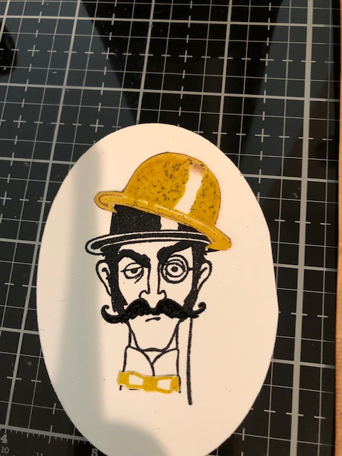 1. Stamp the man with the bowler hat from Inquisitive in black, then emboss with black powder, then stamp him again in Fossilized Amber Oxide and emboss with Fossilized Amber distress glaze. Fussy cut the amber hat and tie and glue them onto the black stamped piece. Color him a bit. I used Prismacolor pencils. Note that apparently I had some black powder still in my tray when I did the glaze, so my hat came out a little speckled. I kind of liked it so I left it, but keep that in mind if you don’t like the speckles. Finish him by glazing his monocle with dimensional glaze if desired. Let dry , then fussy cut him out.