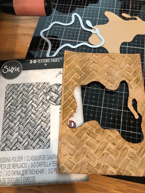 4. I created the background using a piece of beige card stock that I die cut using the largest die from the Splat set. It gives a nice wavy hole for my characters to pop out of. I embossed this piece with the Intertwine embossing folder, then went over it to highlight the pattern using Vintage Photo ink.