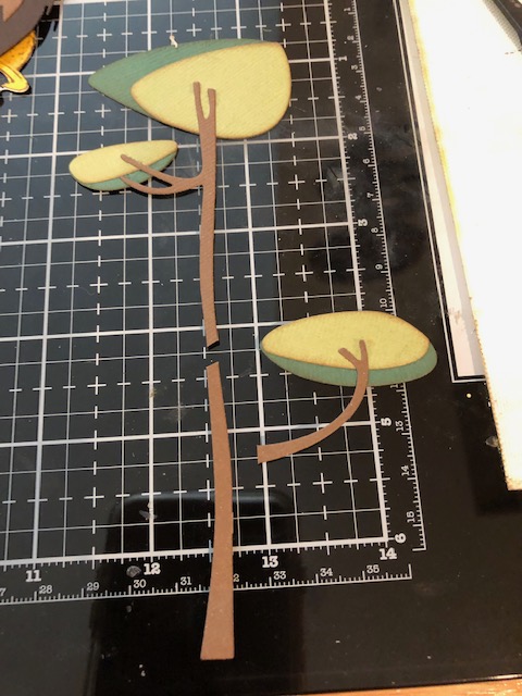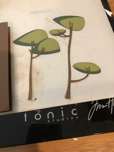 3. Assemble some funky trees. Again they won’t fit as is on the card so I trimmed the tall one as shown and trimmed the shorter one after I had attached it to the card.